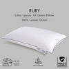 Set Content : Ruby Pillow Color : White Size :Standard - 46 X 69 cm / 18 X 27 Inches King - 51 X 76 cm / 20 X 30 Inches Super King - 51 X 91 cm / 20 X 36 Inches Filling : 100% Goose Down Fabric : 100% Cotton, 300 TC, Cambric Weave, Down Proof Fabric Complimentary: One pillow case with one piece / Two pillow cases with pair.