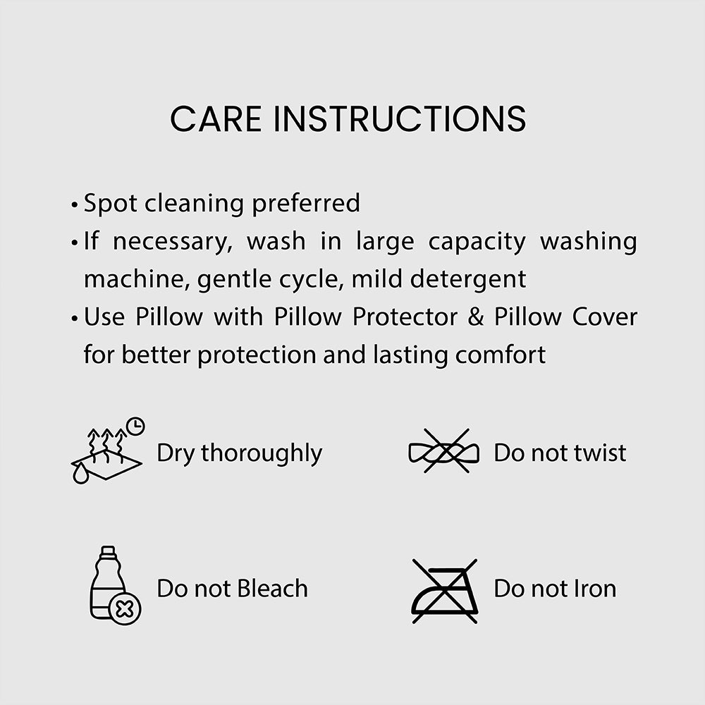 Care Instructions : Always use a cover to prevent pillow from spilling and stain. Store the product in dry and humid free spaces. Expose to sunshine and air periodically to maintain its loftiness. Dry Clean is preferred. Suitable for machine wash at home with a gentle cycle. Don’t use bleach.